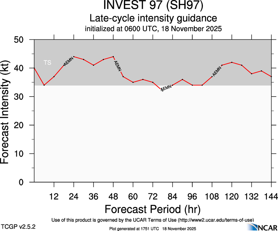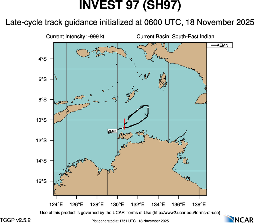 At 0600 UTC, 18 November 2025, INVEST 97 (SH97) was located in the South-East Indian basin at 10.4°S and 130.7°E. The current intensity was -999 kt and the center was moving at -999 kt at a bearing of -999 degrees. The minimum central pressure was -999 mb.